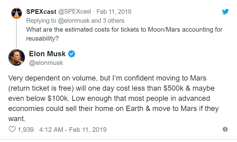 Elon Musk acaba de sugerir que el precio de un viaje de ida y vuelta a Marte podría ser tan bajo como 100.000 dólares. Añadió el calificativo de que el precio depende del volumen. Así que parece que el precio es cualquier cosa menos astronómico.